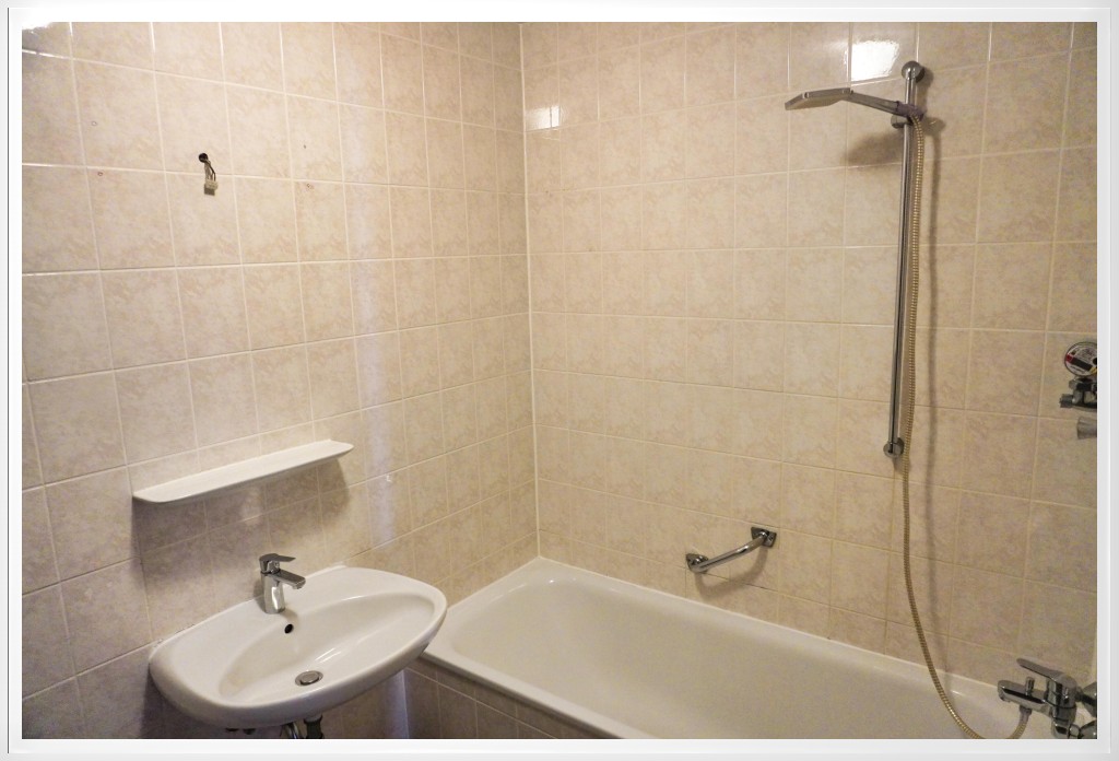 Das hell geflieste Badezimmer ist mit einer Badewanne und einem Waschmaschinenanschluss ausgestattet,