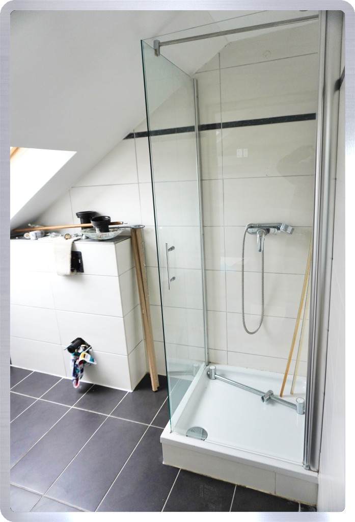 Das Badezimmer ist hell gefliest und mit einer Dusche und einem Fenster ausgestattet.