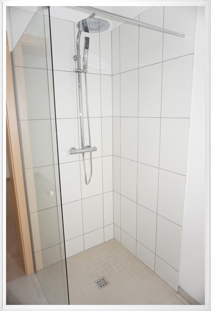 Das Badezimmer ist mit einer ebenerdigen Glasdusche ausgestattet und hell gefliest, hier gibt es auch einen Waschmaschinenanschluss sowie ein Fenster.