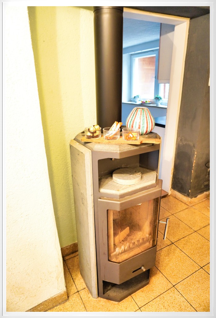 TOP: Ein Kaminofen im Erdgeschoss für Holzbetrieb ist im Betrieb